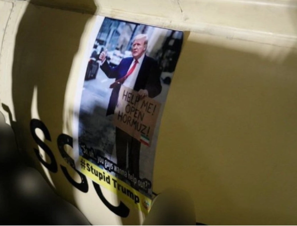 사진에서 트럼프 대통령은 ‘호르무즈 해협을 열어줘’라는 손팻말을 들고 있다. 하단에는 ‘어리석은 트럼프’라며 조롱하는 해시태그가 쓰였다. 해당 미사일을 실제 발사했는지 확인되지 않았으나 곧바로 탄도미사일 발사 장면이 나왔다.