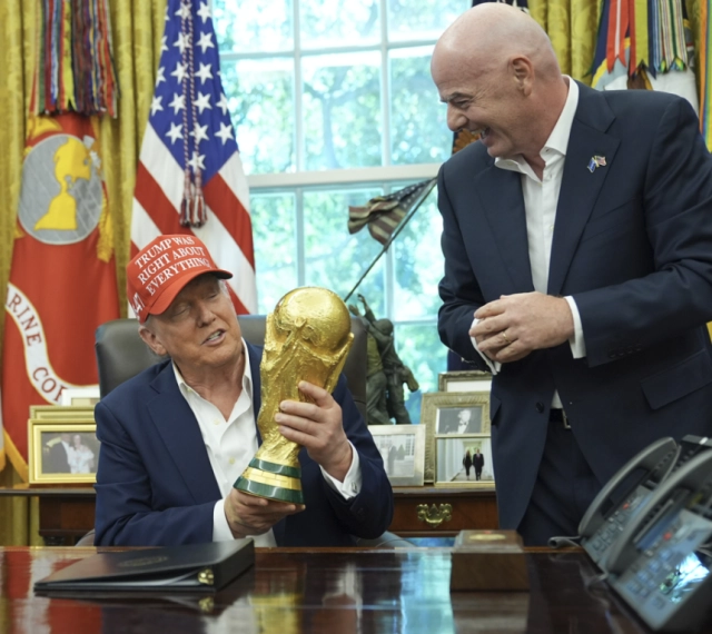 도널드 트럼프 미국 대통령이 지난해 8월 미국 워싱턴DC 백악관 집무실에서 열린 행사에서 잔니 인판티노 FIFA 회장과 대화하며 FIFA 월드컵 우승 트로피를 들어보이고 있다. 워싱턴 로이터 연합뉴스
