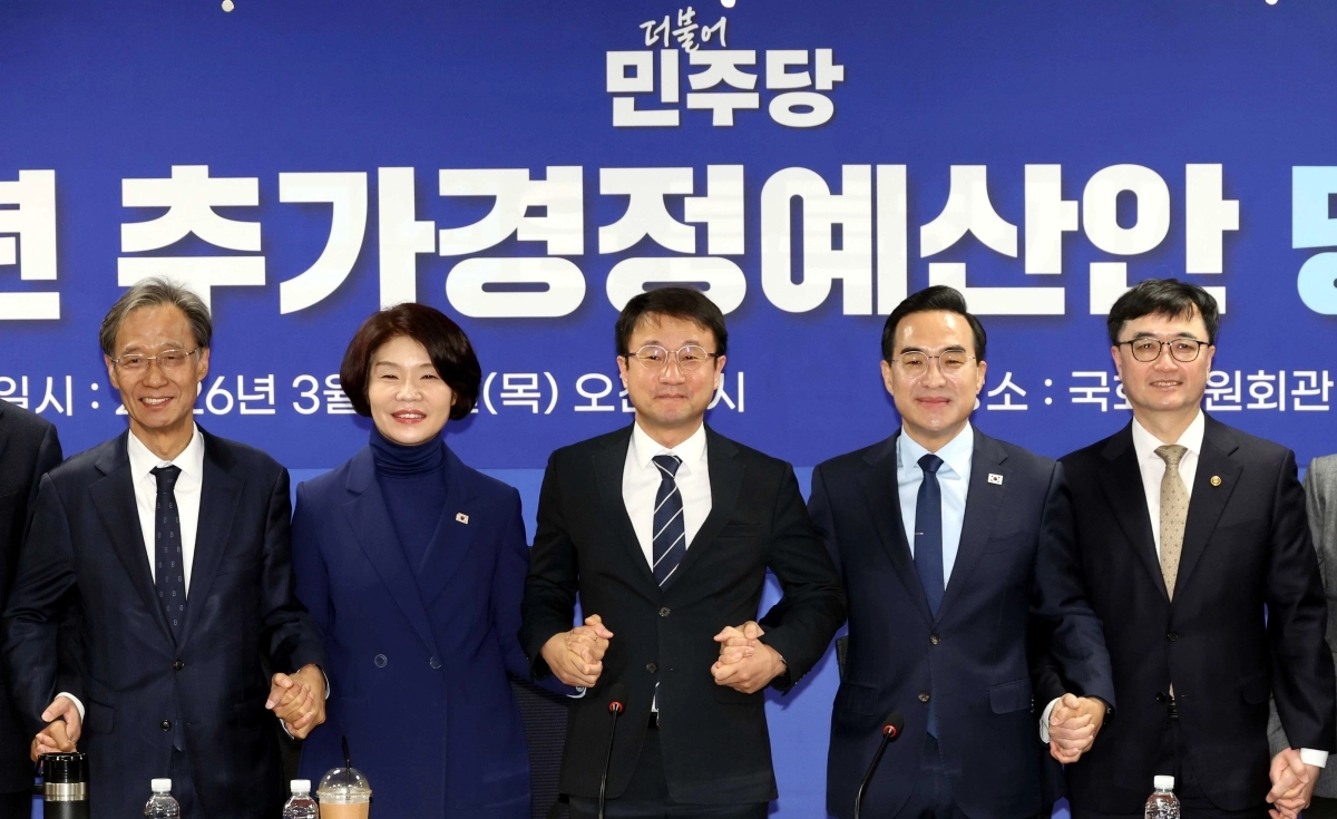 박홍근 기획예산처 장관, 한병도 더불어민주당 원내대표, 한정애 정책위의장 등이 26일 국회의원회관에서 열린 2026년 추가경정예산안 당정 협의에서 기념 촬영을 하고 있다. 왼쪽부터 민주당 유동수 의원, 한 의장, 한 원내대표, 박 장관, 임기근 기획예산처 차관. 2026.03.26.
