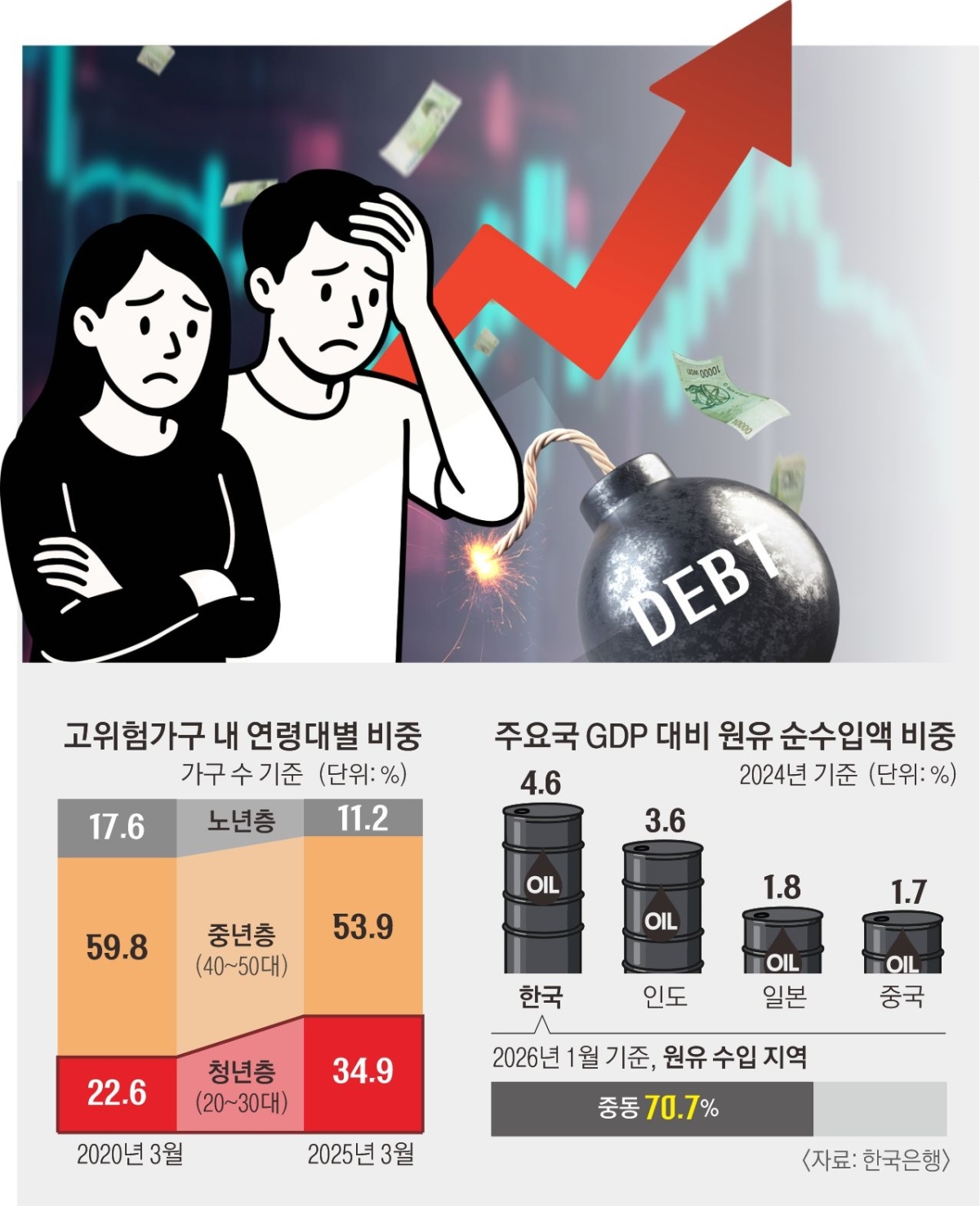 미국·이란 전쟁 여파로 환율·주가 변동성이 커지고 양극화가 심화하면서 한은은 취약차주 연체율 상승과 고위험가구 증가가 맞물릴 경우 금융시스템 전반의 리스크로 번질 수 있다고 경고했다.