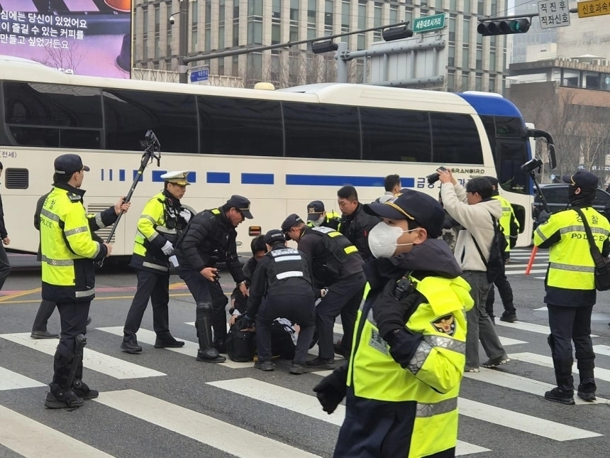 경찰은 “차량 운행에 상당한 지장을 초래하는 만큼 법에 따라 이격 조치를 하겠다”고 경고한 뒤 이들을 물리적으로 끌어내는 중이다.
