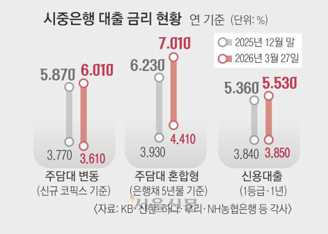 29일 금융권에 따르면 KB국민·신한·하나·우리·NH농협은행의 주담대 혼합형(고정) 금리는 지난 27일 기준 연 4.410∼7.010% 수준으로 집계됐다. 5대 은행 주담대 혼합형 금리가 7%를 웃돈 것은 2022년 10월 이후 처음이다. 지난해 말과 비교하면 상단은 0.780%포인트, 하단은 0.480%포인트 상승했다. 같은 기간 혼합형 금리의 기준이 되는 은행채 5년물 금리는 3.499%에서 4.119%로 0.620%포인트 올랐다.