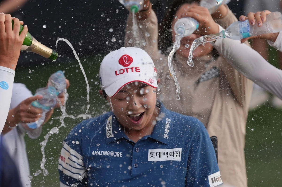 LPGA투어 포드챔피언십에서우승하고 샴페인 세례를 받는 김효주.