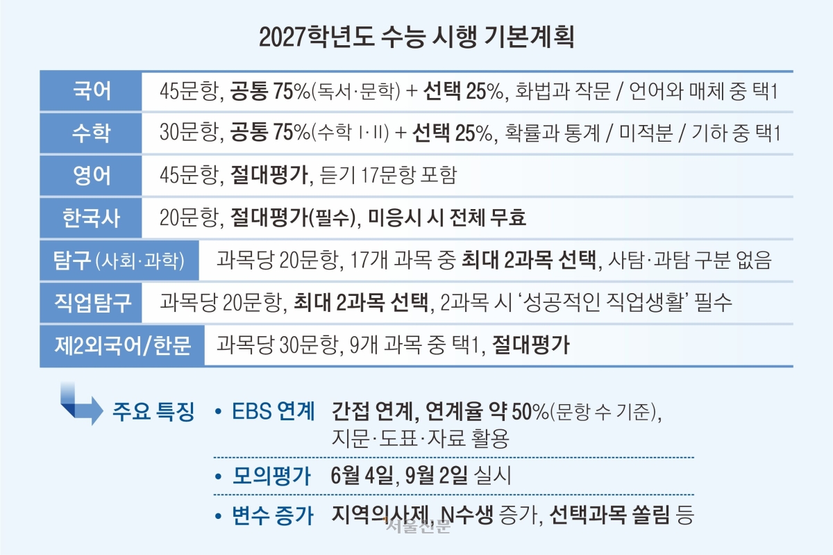 한국교육과정평가원(평가원)이 31일 이러한 내용을 담은 2027학년도 수능 시행 기본계획을 발표했다. 2024학년도 수능부터 이어진 ‘킬러 문항(초고난도 문항) 배제’ 방침은 이번 수능에도 적용된다. 고교 교육과정 중심 출제 기조를 유지하면서 시험의 안정성을 강화하는 데 초점을 맞췄다.
