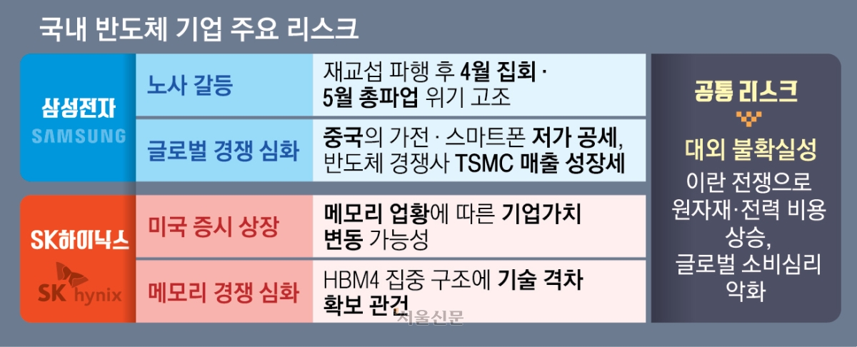 인공지능(AI) 반도체 수요를 바탕으로 호황기에 진입한 국내 반도체 산업이 대내외적인 악재에 직면했다. 주요 고객사들과의 장기공급계약(LTA)을 통해 수익 기반을 다져놓은 상태임에도 불구하고, 이란전쟁과 터보퀀트 변수는 물론 노조 문제 등 예상치 못한 돌발 변수가 쏟아지는 형국이다.