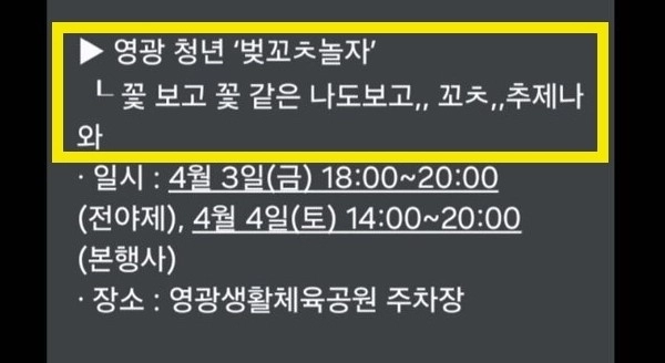 메시지에는 오는 3~4일 영광생활체육공원 주차장에서 열리는 청년 벚꽃축제 ‘벚꽃놀자’ 행사 일정 등이 담겼다.
