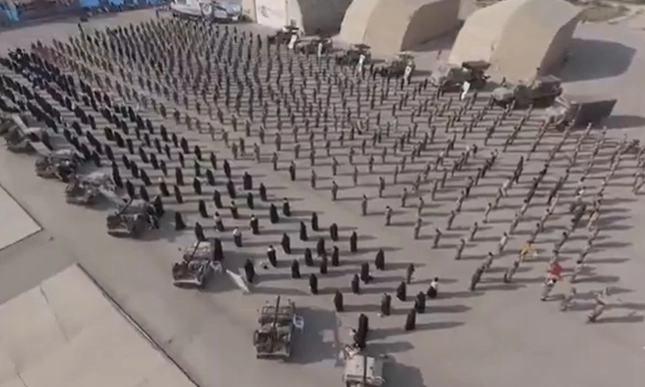 공개된 영상에는 완전 무장한 병력들이 집결한 모습이 담겼다. 대규모로 서 있는 사람들 사이로 여군뿐 아니라 어린이까지 함께 서 있는 모습을 확인할 수 있다.