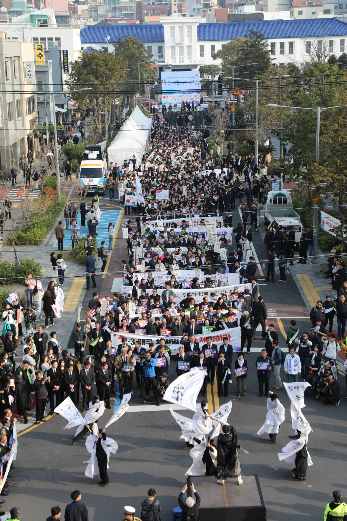 세 갈래로 출발한 행진단은 오후 5시쯤 합류해 제주문예회관까지 공동 행진을 이어갔다.