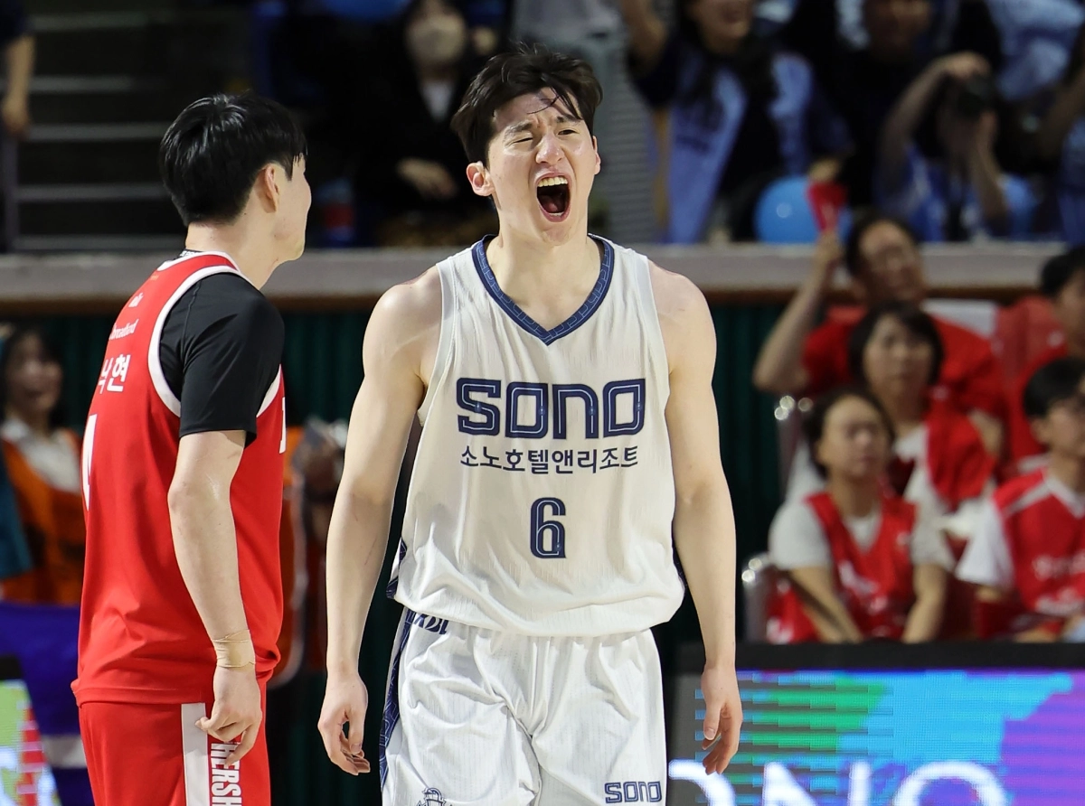 프로농구 고양 소노 이정현이 12일 서울 송파구 잠실학생체육관에서 열린 6강 플레이오프 1차전 서울 SK와의 경기에서 슛을 성공시킨 뒤 포효하고 있다.