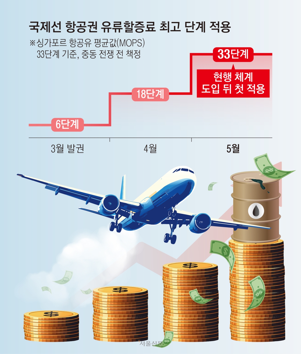16일 항공업계에 따르면 5월 유류할증료 기준인 ‘싱가포르 항공유 평균값(3월 16일~4월 15일)’은 1갤런당 511.21센트로 적용 가능한 최고 단계인 33단계(갤런당 470센트 이상)에 해당했다. 지난달 3단계였던 유류할증료는 이달에 18단계로 올라 역대 최대 상승폭을 기록했는데, 다음달에 33단계로 치솟으며 이 기록을 경신했다. 특히 2016년에 현행 유류할증료 체계가 도입된 후 33단계는 처음이다. 기존 최고 기록은 러시아·우크라이나 전쟁 발발 직후였던 2022년 7월과 8월의 22단계다.