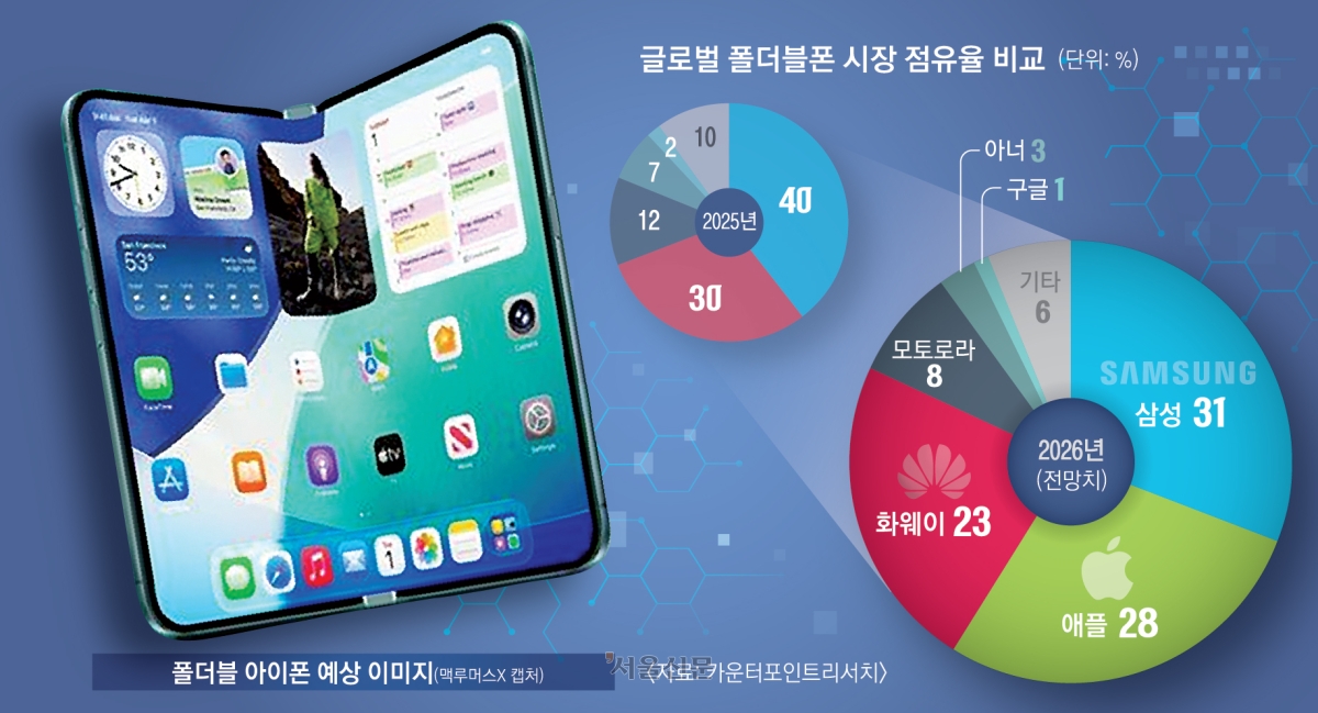 카운터포인트리서치는 애플이 진입 첫해에만 28%의 점유율을 기록하며 시장 판도를 뒤흔들 것으로 보고 있다. 이에 따라 삼성전자의 점유율은 기존 40%대에서 31% 수준으로 조정되며 양강 체제가 굳어질 전망이다. 오포(OPPO)가 주름 단차를 0.05㎜까지 줄인 제품을 내놓고 화웨이가 20일 신작 공개와 함께 ‘트라이폴드폰’으로 틈새를 노리고 있다.