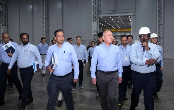 정의선(앞줄 오른쪽 두 번째) 현대차그룹 회장이 지난 1월 인도 푸네 공장 생산 현장을 둘러보고 있다.