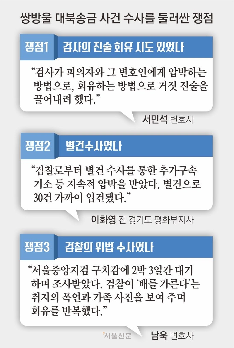 ‘다른 수사로 점프’ 檢 관행 논란대북송금 사건은 ‘별건 수사’ 논란에도 휘말렸다. 해당 수사는 쌍방울을 둘러싼 각종 의혹의 시발점이 된 ‘이재명 변호사비 대납 의혹’ 사건에서 출발했다. 시민단체의 고발로 시작된 변호사비 대납 의혹을 수사하는 과정에서 외화 밀반출 등 쌍방울의 대북송금 정황이 포착된 것이다. 이 전 부지사는 “검찰로부터 별건 수사를 통한 추가 구속 기소 등 지속적 압박을 받았다”고 토로했다.