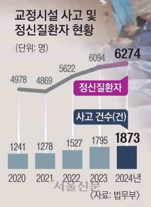 법무부에 따르면 2024년 전국 54개 교정시설에서 1873건의 사고가 발생했다. 2020년 1241건이었던 교정 사고가 4년 만에 600건 이상 증가했다. 특히 야간엔 교도관 1명이 평균 약 50명의 수용자를 담당하게 돼 대처가 어려운 상황이다.