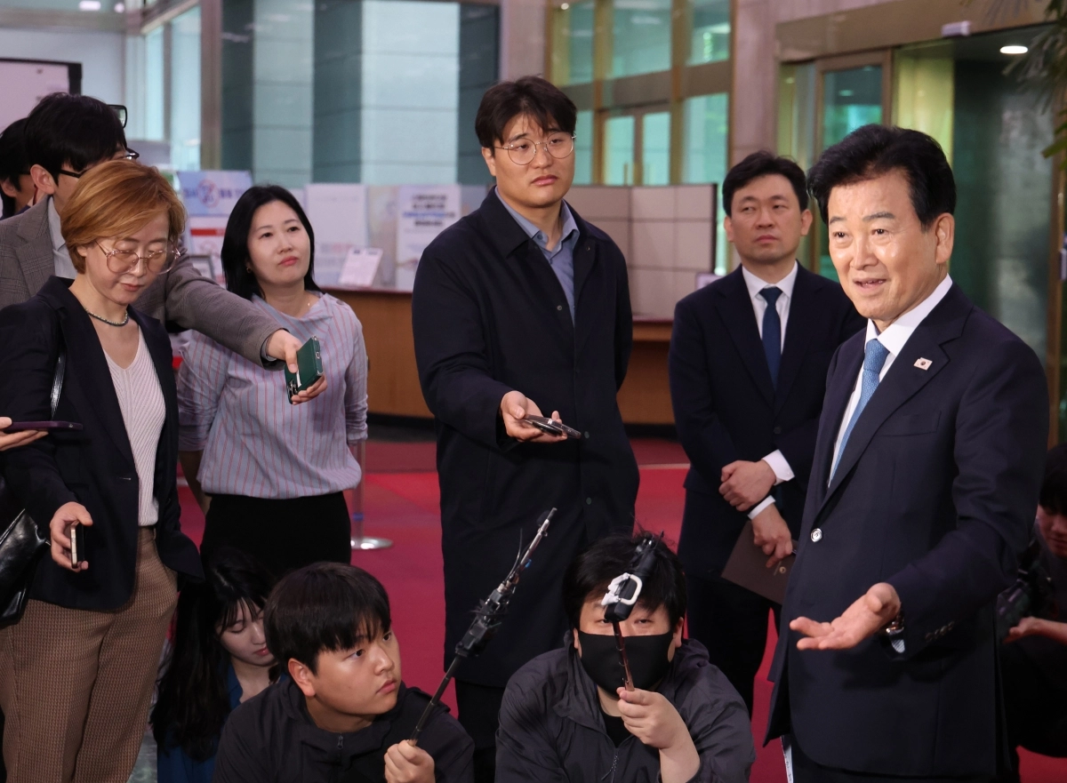 정동영 통일부 장관이 20일 오후 외부 일정을 마친 뒤 서울 광화문 정부서울청사 집무실로 향하며 기자들의 질문에 답하고 있다. 2026.4.20 연합뉴스