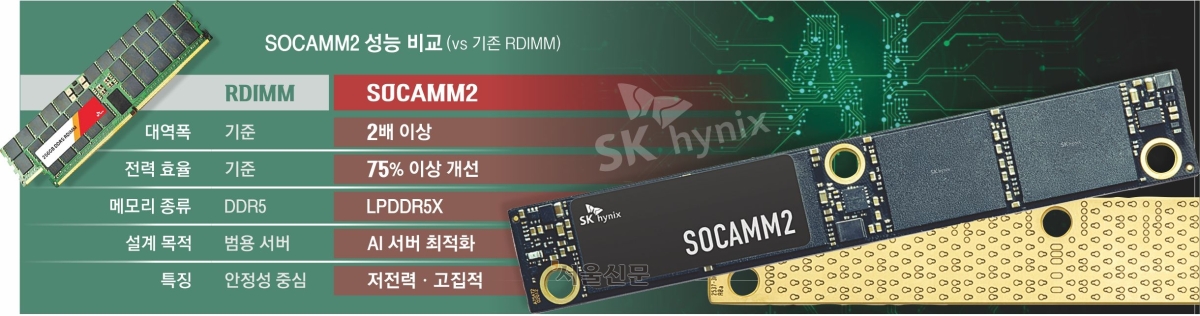 SK하이닉스가 차세대 인공지능(AI) 서버용 메모리 모듈인 ‘소캠2(SOCAMM2) 192GB’를 본격 양산한다고 20일 밝혔다. 스마트폰 등에 쓰이던 저전력 D램(LPDDR5X)을 AI 서버에서 빠른 속도로 구동하면서도 전력 소비는 낮도록 개량한 제품이다. AI의 추론기능이 중요해지면서 전력 소비 대비 높은 성능이 요구되는 가운데 SK하이닉스가 고대역폭메모리(HBM)에 이어 차세대 영역에서도 주도권을 잡겠다고 선언한 셈이다.