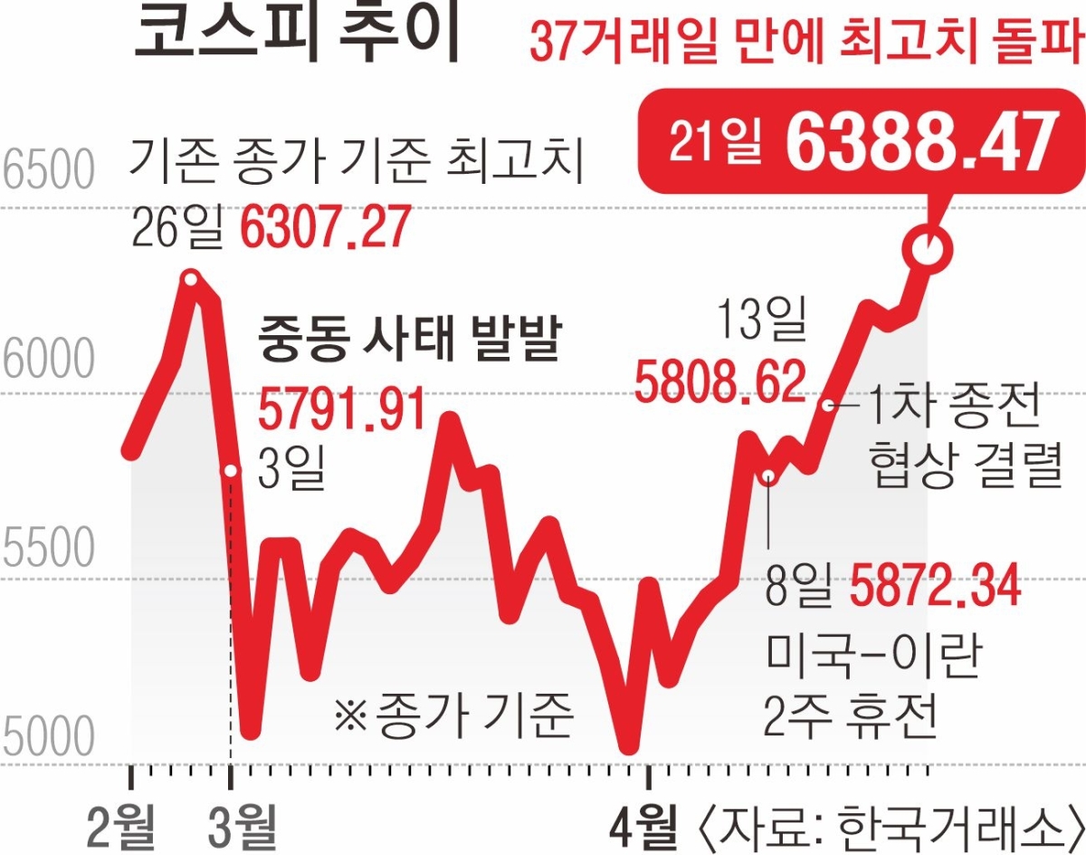 미국과 이란 간 휴전 협상 불확실성에도 코스피가 사상 최고치를 기록한 21일 서울 중구 우리은행 딜링룸에 코스피 종가가 표시돼 있다. 이날 코스피는 전 거래일 대비 169.38포인트(2.72%) 오른 6388.47에 거래를 마쳤다. 도준석 전문기자
