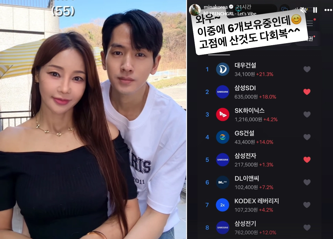 미나·류필립 부부(왼쪽)와 21일 미나가 올린 보유 주식 등 이미지. 미나 인스타그램 캡처