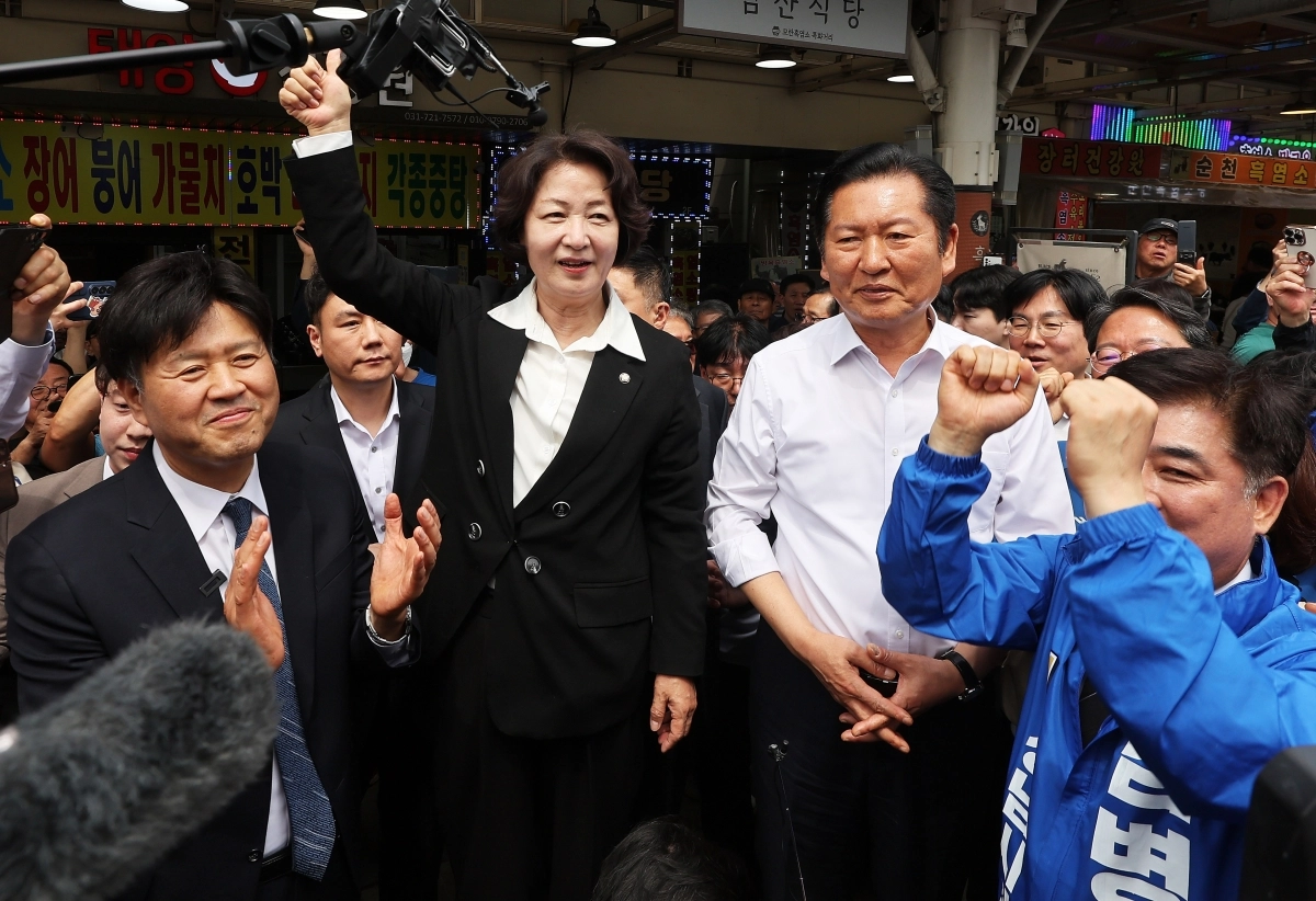 김용(왼쪽) 전 민주연구원 부원장이 지난 19일 경기 성남시 모란 민속 오일장을 방문한 더불어민주당 정청래 대표, 추미애 경기도지사 후보, 김병욱 성남시장 후보 방문 행사에 참석해 손뼉을 치고 있다. 2026.4.19