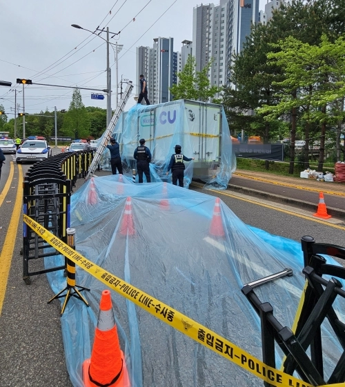 22일 경남 진주시 정촌면 CU 진주물류센터 앞 민주노총 화물연대 조합원이 사망한 사고 현장 보존을 위해 조합원과 경찰이 방수포 작업을 하고 있다. 2026.4.22. 뉴스1