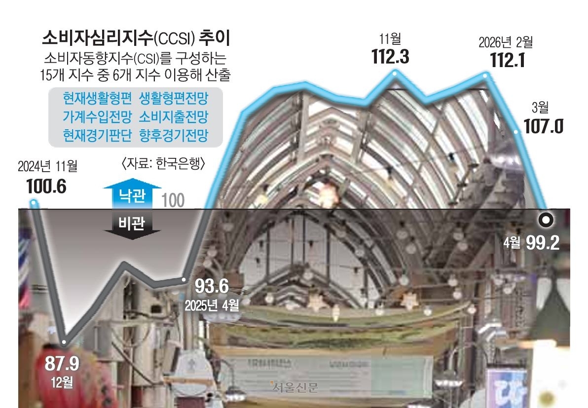 한국은행이 23일 발표한 ‘2026년 4월 소비자동향조사’에 따르면 소비자심리지수(CCSI)는 99.2로 전월 대비 7.8포인트 하락했다. 이 지수가 100을 밑돈 것은 지난해 4월(93.6) 이후 1년 만이다. 하락폭은 비상계엄 사태가 있던 2024년 12월(-12.7포인트) 이후 가장 컸다.