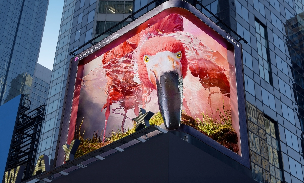 LG전자는 최근 미국 뉴욕 타임스스퀘어 전광판에 ‘LG와 함께하는 멸종위기종 보호 캠페인’의 9번째 영상 ‘플라밍고’ 편을 공개했다. LG전자는 2024년부터 타임스스퀘어 전광판에 멸종위기에 처한 동물을 주제로 한 영상을 상영하고 있다.