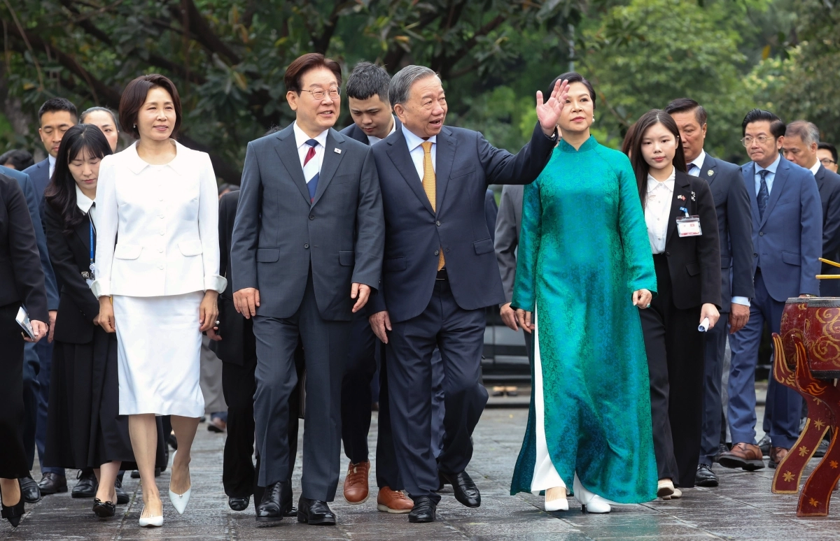 이재명 대통령 부부와 또 럼 베트남 공산당 서기장 겸 국가주석 부부가 24일(현지시간) 베트남 대표 문화 유적인 하노이 탕롱 황성을 둘러보고 있다.