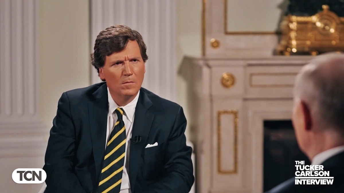 친트럼프 극우논객인 미국 폭스뉴스 앵커 출신 터커 칼슨(왼쪽)은 8일(현지시간) 홈페이지에 블라디미르 푸틴 러시아 대통령과의 인터뷰를 공개했다. 2024.2.8 터커칼슨닷컴