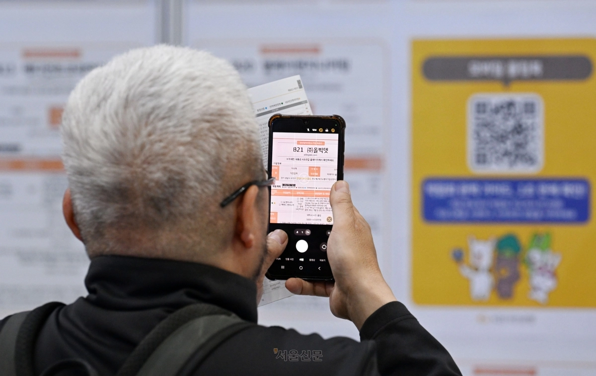 국내 민간 주최 취업박람회 가운데 최대 규모인 ‘2026 제1차 KB굿잡 우수기업 취업박람회’가 27일 서울 강남구 코엑스에서 열린 가운데 한 구직자가 스마트폰 돋보기 애플리케이션(앱)을 이용해 채용 정보를 확인하고 있다. KB국민은행이 주최한 이번 행사는 올해로 29회째이며 누적 방문자 수가 125만명에 이른다. 지금까지 총 6200여개 기업이 참가해 일자리 4만 5000여개를 주선했다.