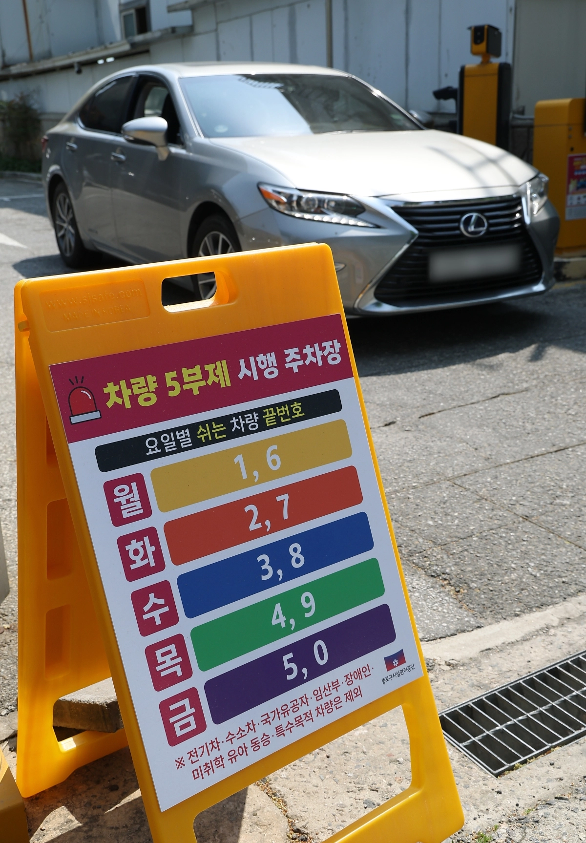 서울 종로구 한 공영주차장에 5부제 관련 안내판이 놓여 있다. 2026.4.27.