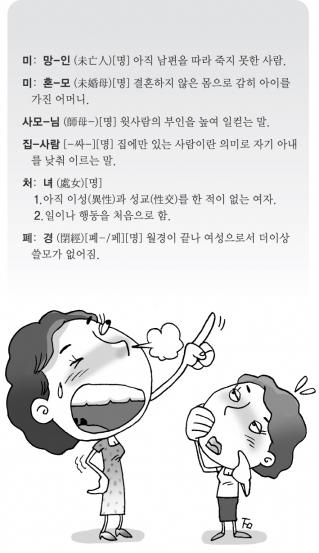 미망인은 ‘아직 죽지 못한 사람’이란 뜻이다.남편을 잃은 여성을 지칭한다.주부 서은진(46)씨는 “미망인이 과부보다는 듣기에 우아한 것 같지만 여자는 남편을 따라죽어야 한다는 시대착오적이고 가부장적인 속뜻을 숨기고 있다.”고 지적했다.하지만 광고회사 디렉터 김영진(44)씨는 “뜻은 충분히 공감한다.”면서 “그렇지만 미망인 말고 따로 부를 말이 없는 것 같다.”고 ‘현실적인 문제’를 지적했다.