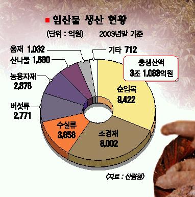 2003년 말 기준으로 우리나라 국토의 65%인 650만 2000㏊가 산이다.그러나 산에서 얻어지는 임산물 생산은 국내총생산의 0.5%(3조 1083억원)에 불과하다.지난 30년간 이뤄진 산림정책의 근간이 치산녹화에 집중됐기 때문이다.심고 기르기만 했지 활용은 미흡했다.그러나 이제 산림정책이 변하고 있으며 변해야 한다.