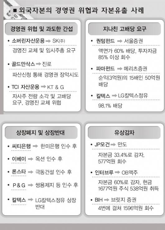 국내기업에 대한 외국인의 경영권 위협과 간섭은 도를 넘어선 지 오래다. 재벌이건 개별기업이건 자신들의 투자이익을 극대화하는 일이라면 닥치는 대로 공격에 나선다.