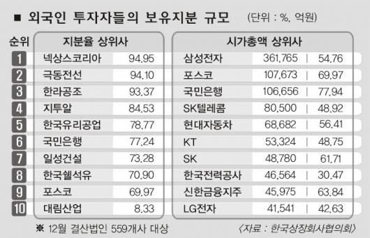 대한해운은 지난 7월 이후 노르웨이 해운사인 골라LNG가 지분을 30.56%로 늘리면서 직접적으로 경영권 위협을 받고 있다. 현대상선도 골라LNG를 비롯한 북유럽계 지분이 최근 15%를 넘었다. 미국 자산운용사인 캐피털그룹은 최근 현대자동차 지분을 14.61%로 확대해 2대 주주로 올라섰다. 캐피털측은 ‘단순 투자’라고 하지만 ‘제2의 소버린’이 안 된다는 보장이 없다. 외국인 지분율이 높은 우량기업들은 어디건 홍역을 치른다. 삼성전자는 사외이사 추천권 요구, 본사 미국 이전 등을 외국인들로부터 요구받고 있다.