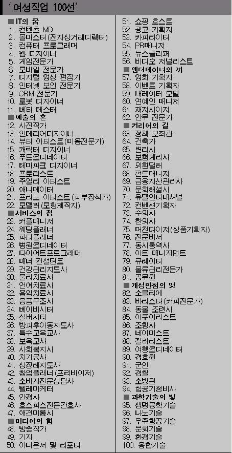 여성부, 노동부, 교육인적자원부, 한국직업능력개발원 등 공공기관의 연구결과를 바탕으로 100개의 직업을 ▲IT의 힘 ▲서비스의 정 ▲예술의 혼 ▲미디어의 힘 ▲엔터테이너의 끼 ▲커리어의 길 ▲개성의 멋 ▲과학기술의 빛 등 8개 부문으로 나누어 소개했다.