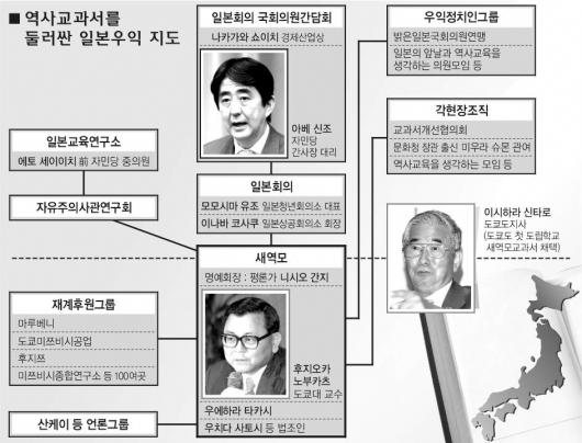새역모는 단순한 연구모임이나 단체가 아니다. 역사문제를 다루는 우익 모임으로는 자유주의사관연구회, 일본교육연구소, 역사교과서시정을 요구하는 모임 등이 있다. 이 가운데 가장 두드러지는 조직이 바로 새역모다. 자유주의사관연구회의 회원 대부분은 새역모 회원이다. 자유주의사관연구회는 일본교육연구소와 연결돼 있다. 일본교육연구소의 핵심인물은 전 자민당 중의원 에토 세이이치(衛藤晟一)다. 그는 자민당 역사검토위원회, 밝은일본국회의원연맹, 일본의 앞날과 역사교육을 생각하는 모임 등 우익 국회의원 단체들을 주도하고 있다.