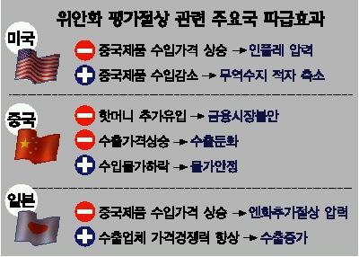 위안화가 평가절상되면 중국 시장에서 한국 제품의 수입가격이 떨어지는 효과가 나타난다. 또 제3국 시장에서 중국과 경쟁하고 있는 업종은 혜택을 본다. 반면 중국의 경제성장률이 떨어지면서 중국내 수입수요가 줄 수 있다.