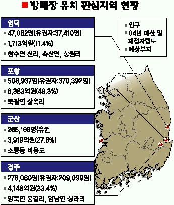 경주 등 방폐장 유치 신청서를 정부에 이미 냈거나 예정 중인 지자체들이 모두 동·서해안에 위치해 그 배경에 관심이 모아지고 있다.