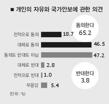 개인의 자유와 권리를 강화해 자유민주주의체제를 확고히 하는 것이 궁극적으로 국가안보를 튼튼하게 하는 일이라는 데 대해 65%가 전적으로 동의했다. 하지만 성·연령·소득별로 따지면 차이가 두드러진다. 남성은 여성에 비해 자유민주주의적 가치와 국가안보에 적극적이다. 남성의 동의율은 67.6%인 반면 여성은 63.0%이다. 고소득층과 중산층은 67%대로 저소득층 60.2%와 비교가 된다.40대가 동의하는 비율은 다른 연령대와는 차이가 확연한 편이다.40대는 69.3%나 된다. 전적인 동의가 22.8%, 대체로 동의가 46.5%이다.30대는 67.7%,20대는 63.5%이다.50대 이상은 61.2%로 의외로 가장 낮다.