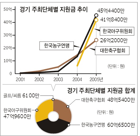 스포츠토토는 지난 2001년 축구토토 발매를 시작으로 농구 골프 야구 씨름 배구 등 6개 종목으로 늘어났다. 이 가운데 씨름토토는 2004년 하반기에 두 차례 시행된 후 프로씨름이 와해되면서 발매가 중단된 상태다. 게임 참가자가 경기결과를 분석, 예측한 뒤 베팅해 결과에 따라 적중 상금을 지급받는 방식으로 운영된다.