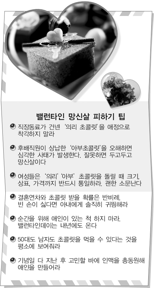밸런타인데이인 14일 증권회사에 근무하는 이주원(가명·32) 대리는 출근 후 동료 여직원이 건넨 초콜릿 때문에 하루 종일 싱글벙글이었다. 아침에 이 대리의 책상 위에는 ‘해피 밸런타인! 맛있게 드세요.’란 메모와 함께 초콜릿 한 조각이 가지런히 놓여 있었다. 평소 호감을 갖고 있던 그녀로부터 받은 것이기에 더욱 의미가 깊다.