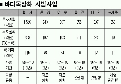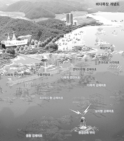 바다목장화 사업은 이미 그 성과가 나타나고 있다.1998년 시작된 통영 바다목장화 사업은 내년 상반기중에 사업이 완료된다. 바다목장이란 종묘생산에서 어획에 이르기까지 과학적인 생산관리 시스템을 구축해 환경친화적인, 울타리 없는 양식업을 실현하기 위해 시작됐다. 연안해역에 인공어초 등을 설치해 수산생물의 서식공간을 제공하고 수자원을 회복시키는 데 그 목적이 있다. 나아가 관광레저공간으로 활용할 계획이다. 통영에 이어 여수(다도해형)와 울진(관광형), 태안(갯벌형), 북제주(체험·관광형)에도 테마별 시범사업이 추진되고 있다.