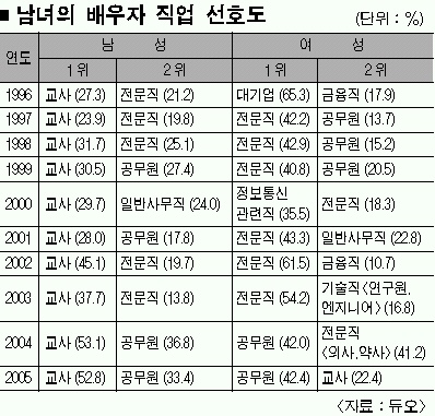 결혼정보회사 ㈜듀오가 1996∼2005년 남녀별 배우자 직업 선호도를 분석해 본 결과 여성의 경우 경기 사이클과 여성의 사회적 위치에 따라 이상적으로 꼽는 직업에 차이가 났다.