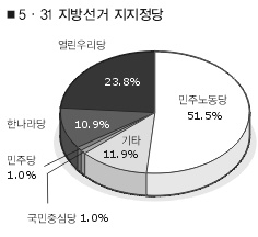 5·31 지방선거에서 절반이 넘는 51.5%가 민주노동당을 지지했다. 열린우리당 지지자는 23.8%로 절반 수준이었다. 과거 학생운동권이 ‘타도대상’으로 삼았던 민자당-신한국당을 뿌리로 한 한나라당을 지지한 사람은 10.9%였다. 전대협 세대는 민주노동당(20.5%)보다 열린우리당(38.5%)을 더 많이 지지한 반면 한총련 세대는 열리우리당보다 민주노동당을 압도적으로 지지하는 것으로 나타났다.