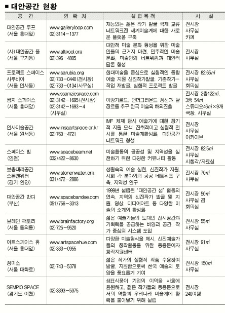 서울과 지방에서 운영 중인 대안공간들은 각자의 모토는 조금씩 다르지만, 대체로 재능있는 젊은 작가 발굴과 대안적 미술문화 형성을 위한 근거지 마련, 실험적 프로젝트 발굴, 미술인 네트워킹을 통한 문화적 소통 등을 내걸고 운영해 왔다. 지난 1999년 서울에서 대안공간 루프 설립을 시작으로 부산, 대구, 창원, 수원으로까지 확산됐다.