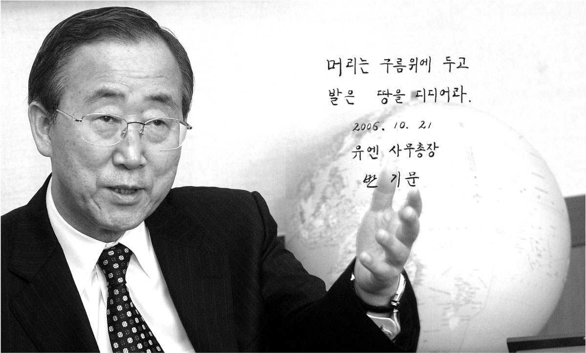 ‘한국인 출신’ 유엔 사무총장 반기문. 분단 국가 대한민국의 청소년들에게 ‘꿈은 이루어진다.’는 신화를 만들어준 반기문 외교통상부 장관이 20일 서울신문과 인터뷰를 가졌다. 한달 후면 36년간의 한국 외교관 생활을 접고 국제사회의 평화 조정자의 막중한 역할을 위해 뉴욕으로 떠나는 그에게 청소년들을 위한 삶의 메시지와 유엔사무총장으로서 포부를 들어봤다. 반 차기 사무총장은 “순수한 마음을 얼마나 오랫동안 가지느냐가 성공을 좌우한다.”면서 “이는 상대방에게 신뢰 믿음을 주는 것”이라고 말했다. 그는 이를 ‘여일(如一)한 마음’이라고 표현했다.