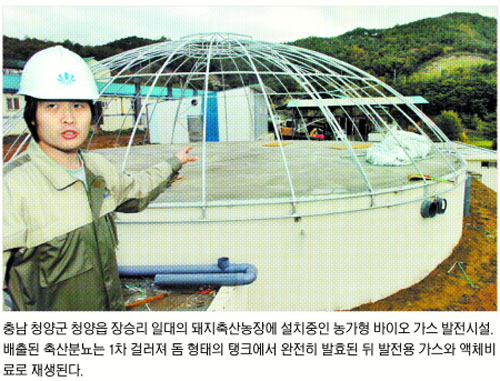 고유가에 대비한 신재생 에너지 등 대체 에너지 발굴에 소매를 걷어붙인 농가가 있다.‘칠갑산’으로 유명한 충남 청양. 청정 농업지역의 대명사격인 이곳 청양읍 장승리 일대 야산에서 돼지 4000마리를 키우는 대규모 축산농장에 중장비를 동원한 공사가 한창이다. 신재생에너지를 전문으로 하는 한 중소기업이 내년 하반기를 완공 목표로 시행중인 축산분뇨 처리를 통한 바이오 가스 발전시설(BIO GAS PLANT) 설비공사다. 정부가 2012년부터 축산폐기물의 해양투기를 전면 금지함에 따라 축산분뇨의 정화와 여기서 발생하는 가스를 발전해 에너지로 쓰는 실험적인 대안이 이곳에서 이뤄지고 있다.1차로 거른 돼지분뇨를 발효하고 메탄가스를 채집하는 돔(dome)의 골격을 완성하느라 분주한 현장 책임자 박경호씨(36 ).