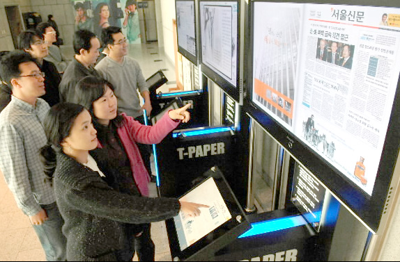서울신문은 9일 프레스센터 1층 로비에서 최첨단 전자신문인 T-Paper 개통식을 가졌다. 서울신문과 (주)다하미커뮤니케이션즈가 공동으로 개발한 T-Paper시스템은 50인치 크기로 신문을 판형 그대로 디지털TV를 통해 볼 수 있도록 한 새로운 개념의 전자신문이다. 이번에 설치한 시스템은 기존 제품에 비해 사용자 편리성을 대폭 개선, 기사검색 기능을 최초로 도입했다. 또 문자와 동영상을 동시에 송출할 수 있는 등 다양한 기능을 갖추고 있다.