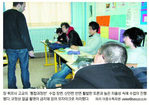 |파리 이종수특파원|파리 13구 파테가(街) 121번지에 자리잡은 장 뤼르사 고교. 이 학교는 정규 고교과정에서 탈락한 학생들을 재교육시키는 1년 과정의 공립학교다. 당연히 학생들의 나이도 16∼20세로 일반고교보다 많다.1년 과정이 끝나면 학생들은 자기 희망에 따라 고교로 복귀할 수도 있고 직업학교로 진학하기도 한다.‘대안 교육’ 성격을 띤 학교다.
