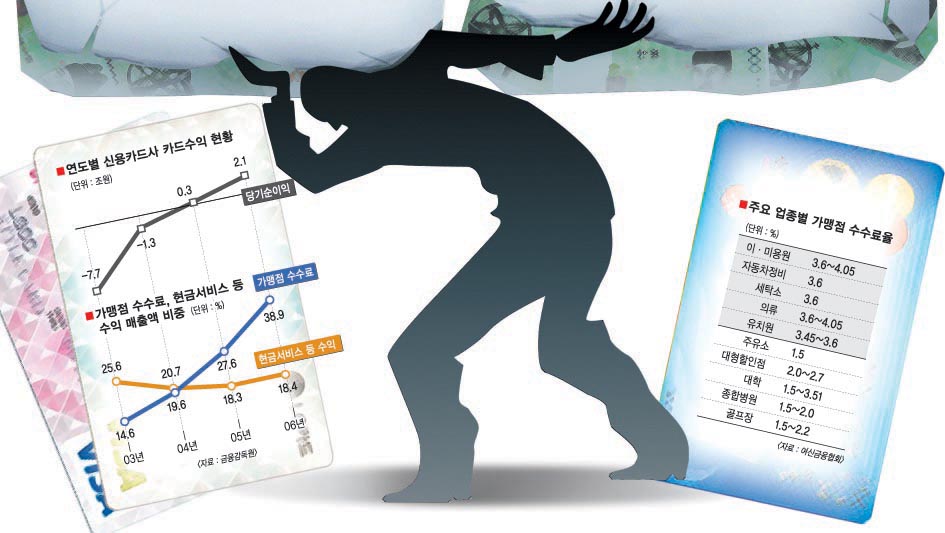 반면 가맹점 수수료의 비율은 같은 기간 14.6%에서 38.9%로 뛰어올랐다. 당기순이익도 덩달아 7조 7000억여원 손실에서 2조 1000억원 흑자로 돌아섰다. 카드사 입장에서는 가맹점 수수료 수익이 현금서비스 등을 대체한 새로운 ‘황금 어장’으로 떠오른 셈이다.
